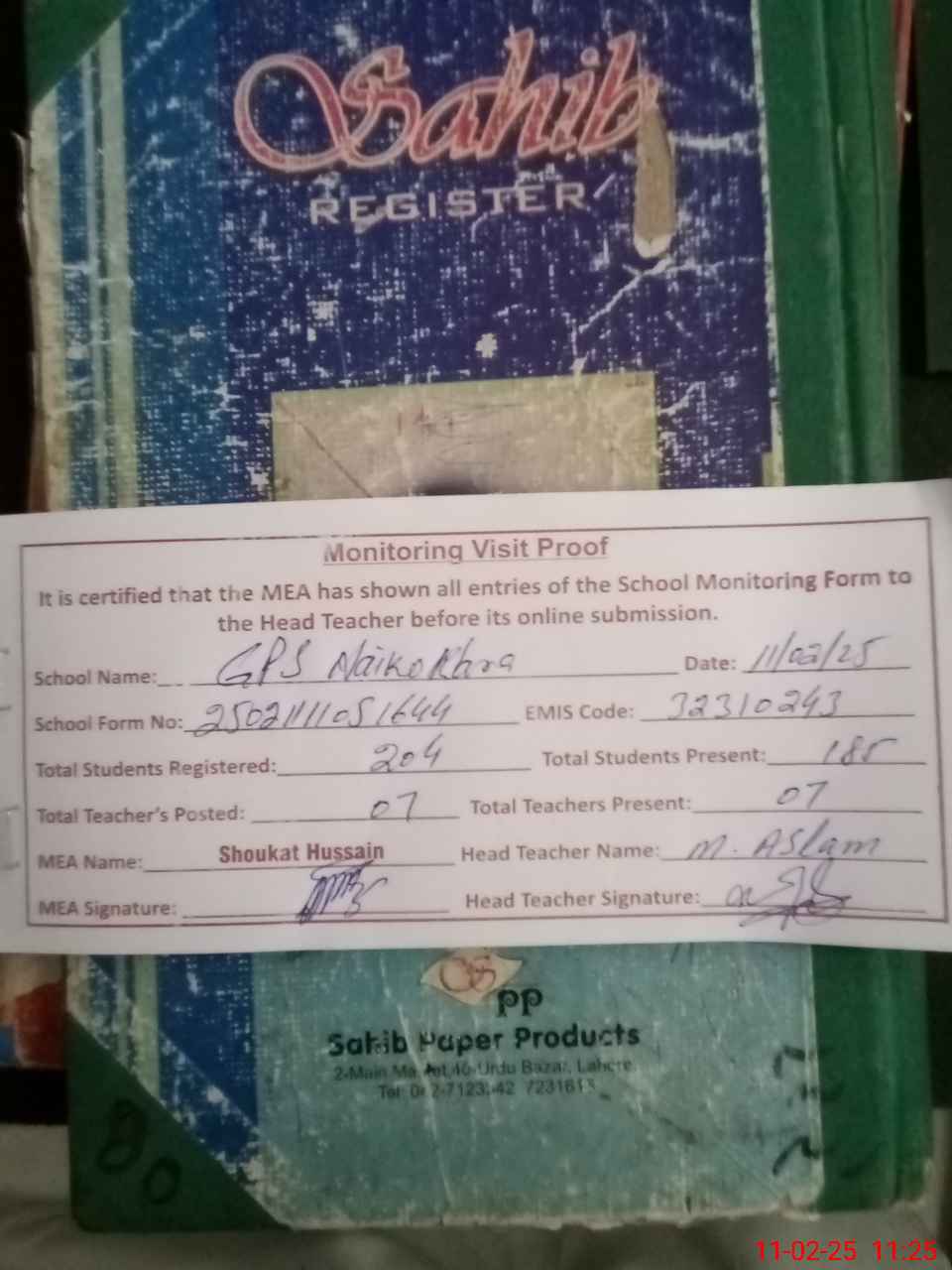 | Attendance Register | Head Teacher | MEA with School | Visit Proof |