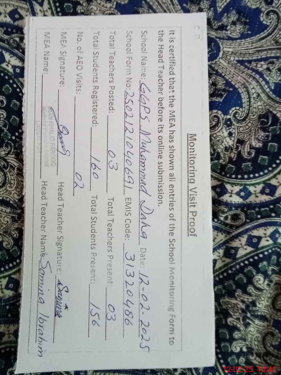 | Attendance Register | Head Teacher | MEA with School | Visit Proof |