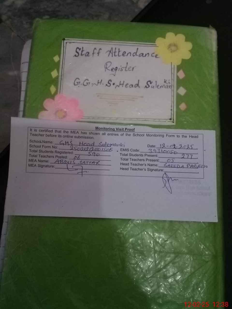 | Attendance Register | Head Teacher | MEA with School | Visit Proof |