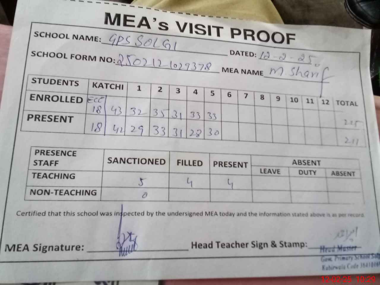 | EMIS Code: 36410169 | Name of School: GPS SOLGI, P/O JAWIND SING WALA, KABIRWALA | |||