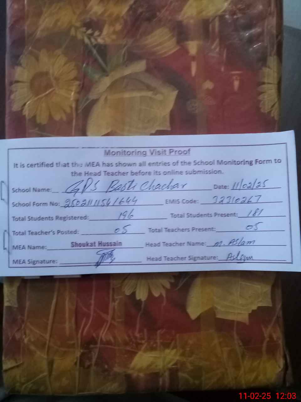 | Attendance Register | Head Teacher | MEA with School | Visit Proof |