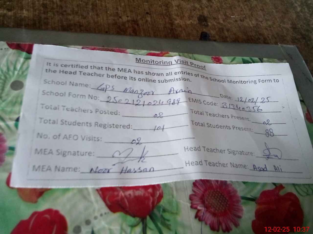 | Attendance Register | Head Teacher | MEA with School | Visit Proof |