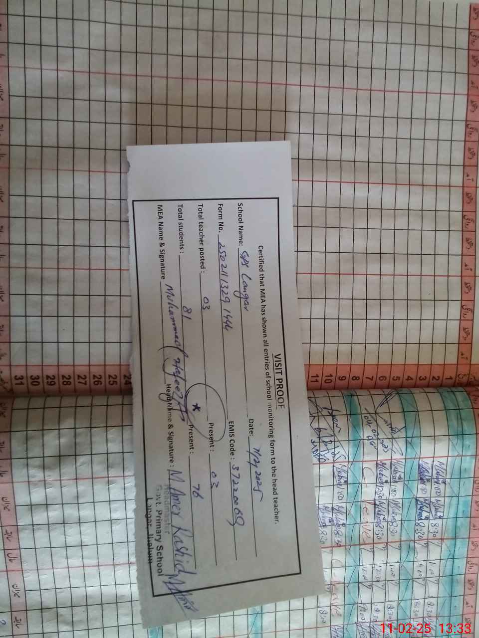 | Attendance Register | Head Teacher | MEA with School | Visit Proof |