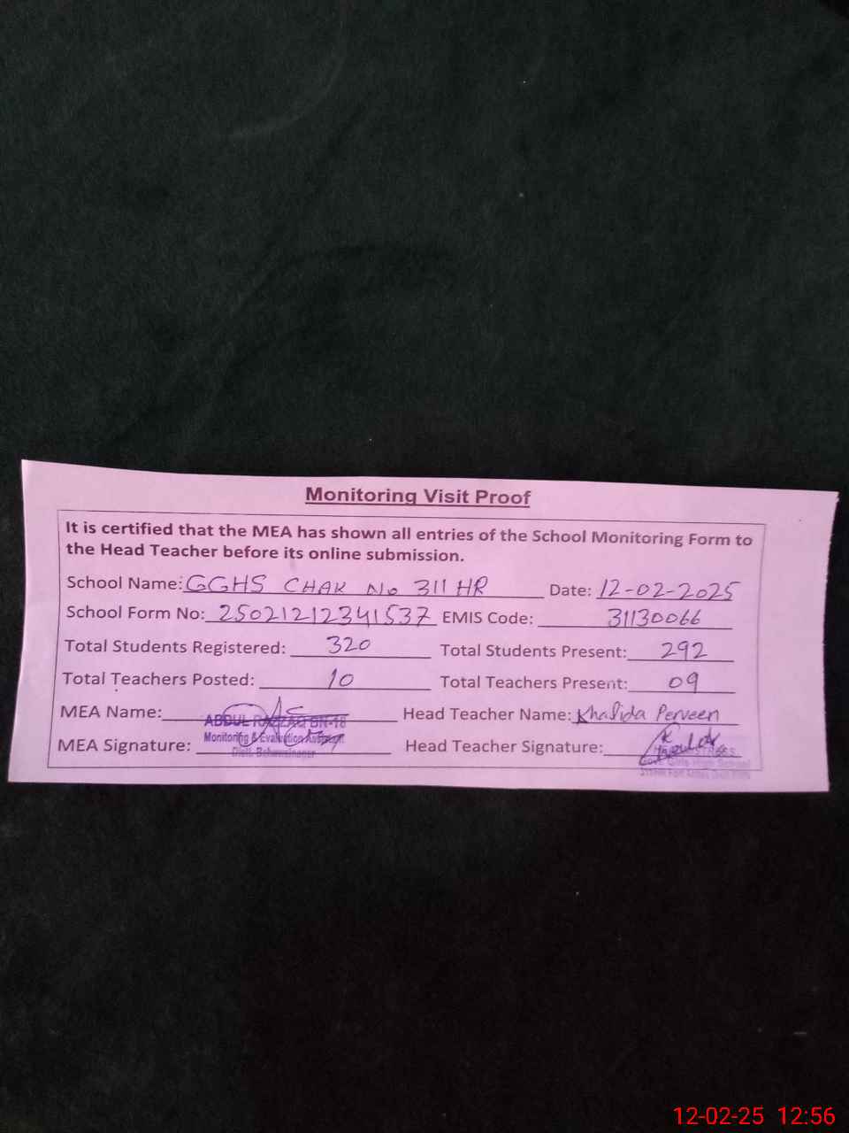 | Attendance Register | Head Teacher | MEA with School | Visit Proof |