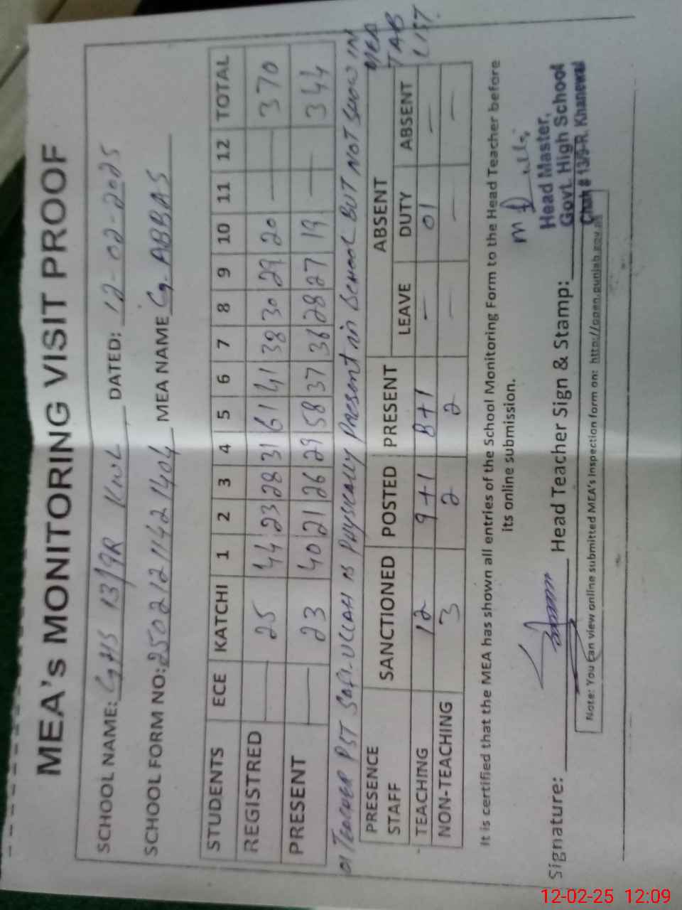 | Attendance Register | Head Teacher | MEA with School | Visit Proof |