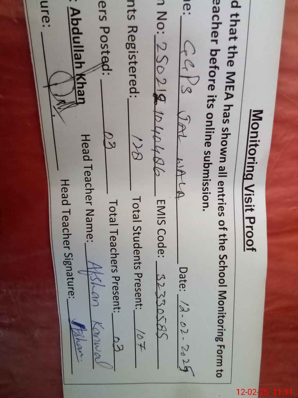 | Attendance Register | Head Teacher | MEA with School | Visit Proof |