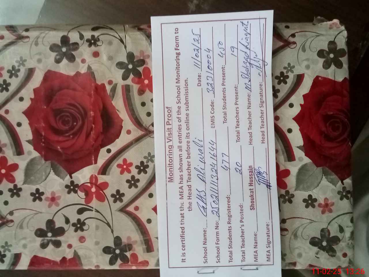 | Attendance Register | Head Teacher | MEA with School | Visit Proof |