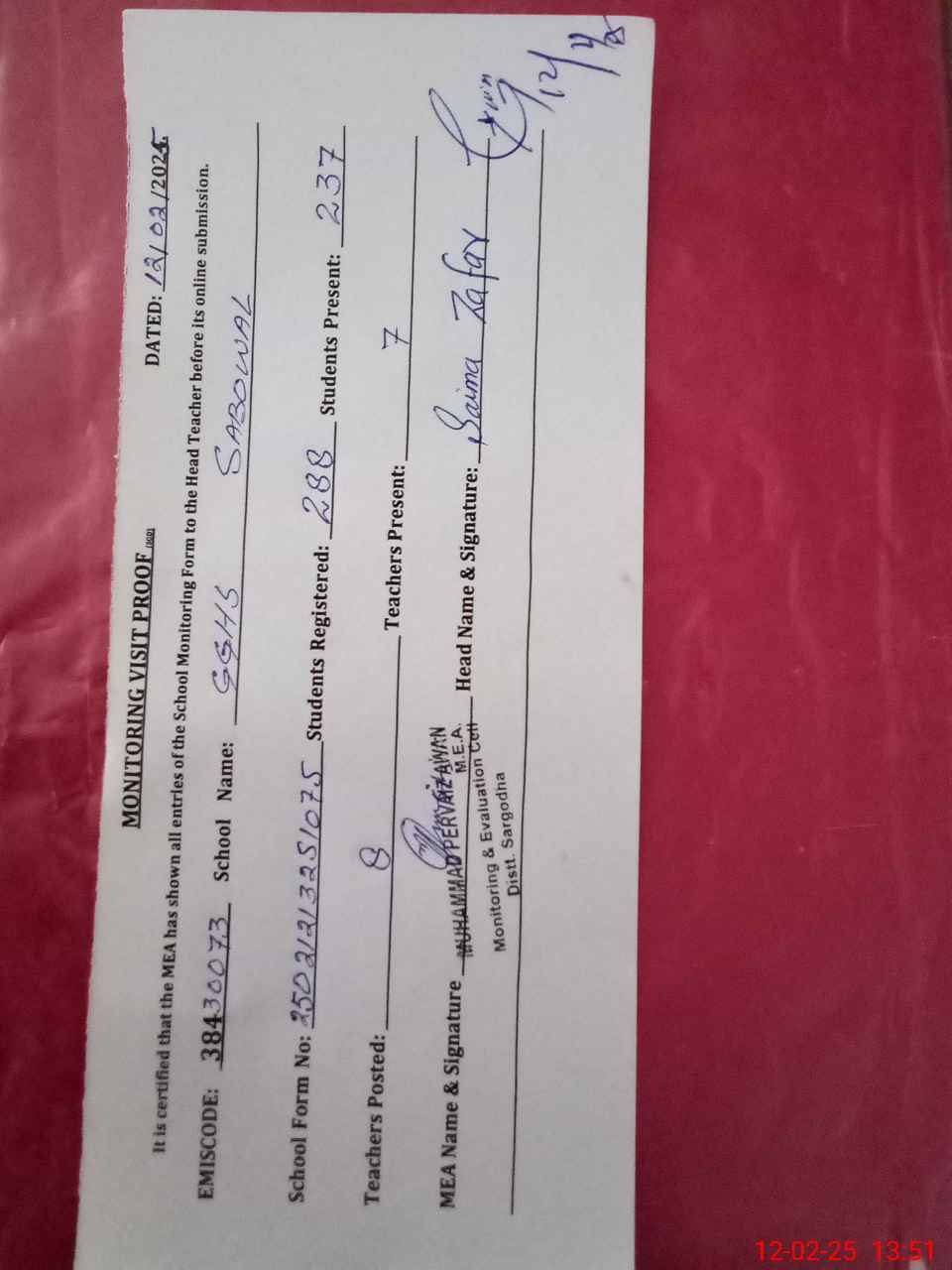 | Certified that this School was Inspected by the Undersigned MEA/DMO Today and the Information Stated Above is as Per Record. | |||||