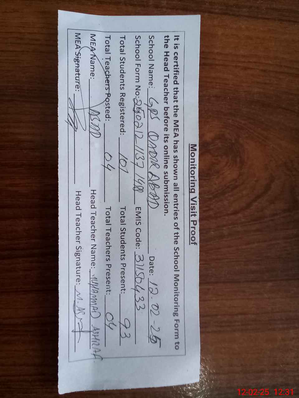 | EMIS Code: 31150433 | Name of School: GPS QADIR ABAD | |||