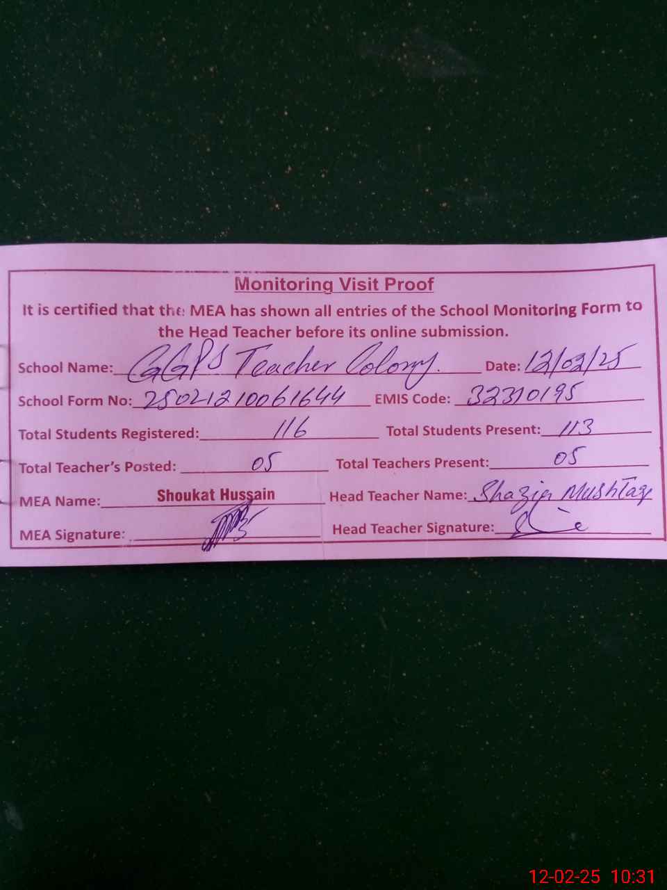 | Attendance Register | Head Teacher | MEA with School | Visit Proof |