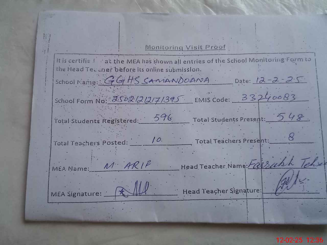 | Attendance Register | Head Teacher | MEA with School | Visit Proof |