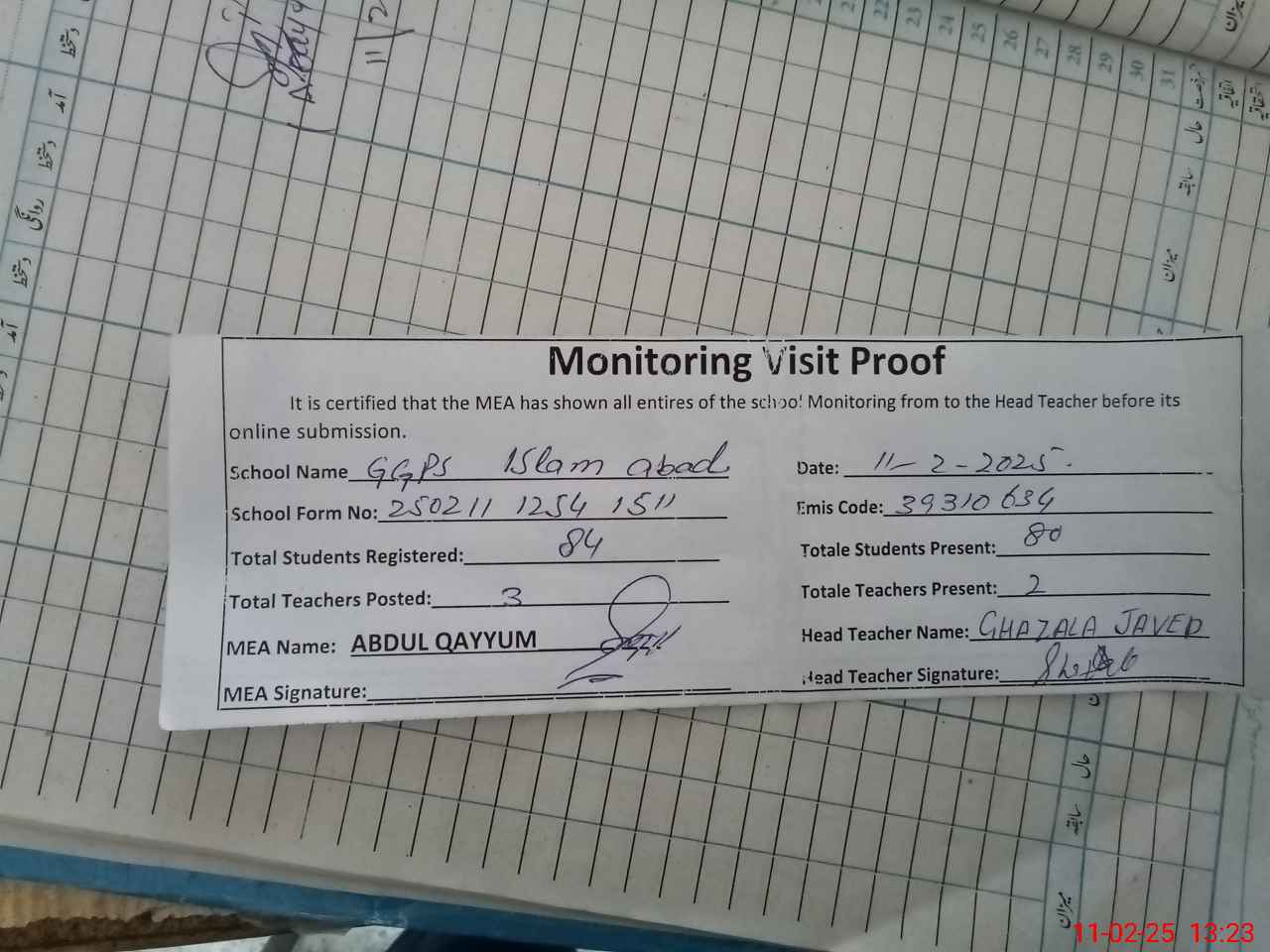 | Attendance Register | Head Teacher | MEA with School | Visit Proof |