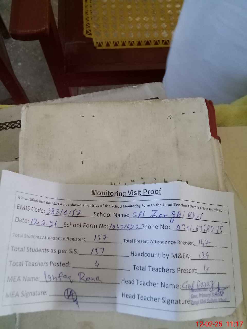 | Attendance Register | Head Teacher | MEA with School | Visit Proof |
