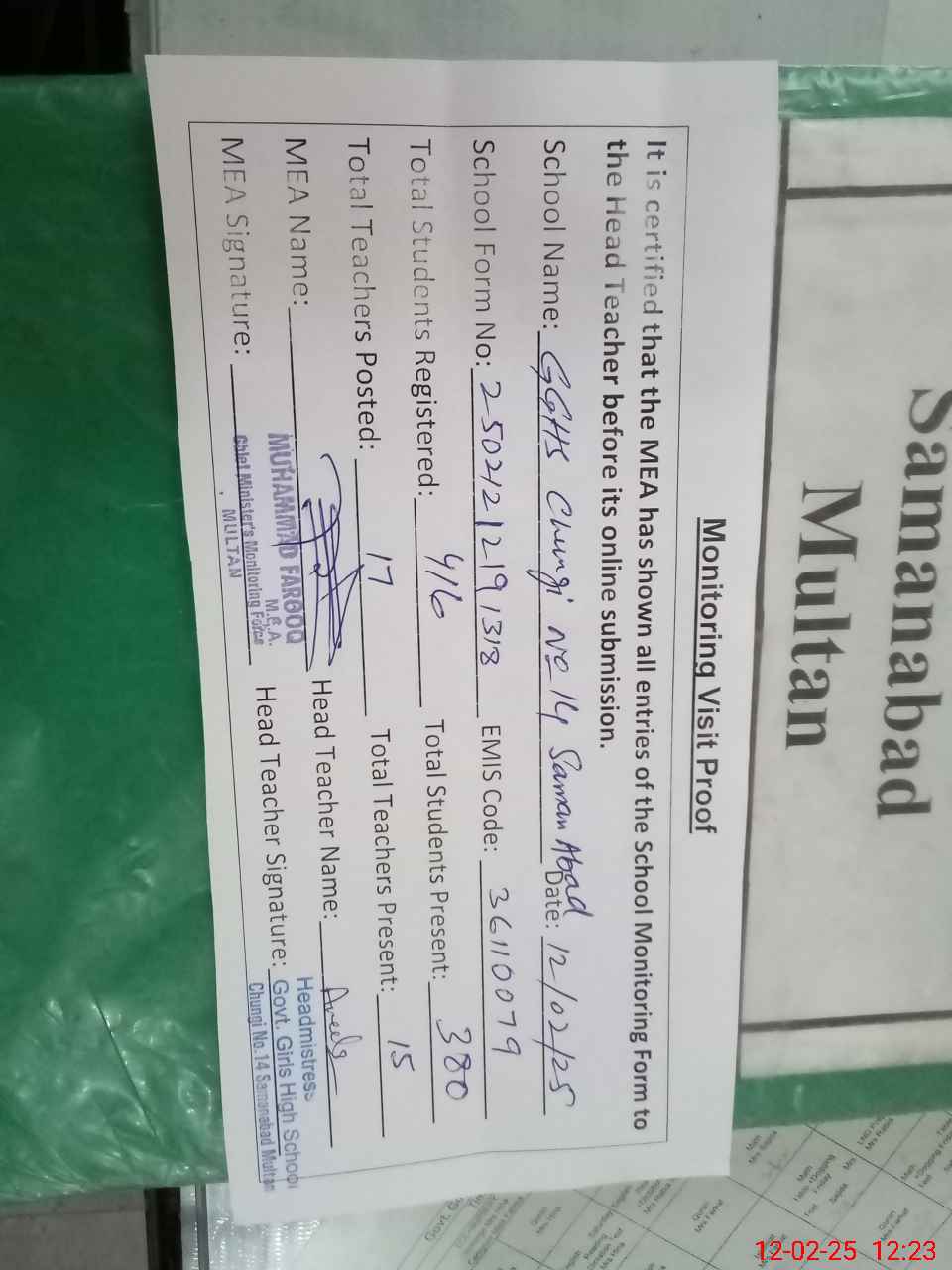 | EMIS Code: 36110079 | Name of School: GGHS CHUNGI NO. 14 SAMANABAD MULTAN | |||