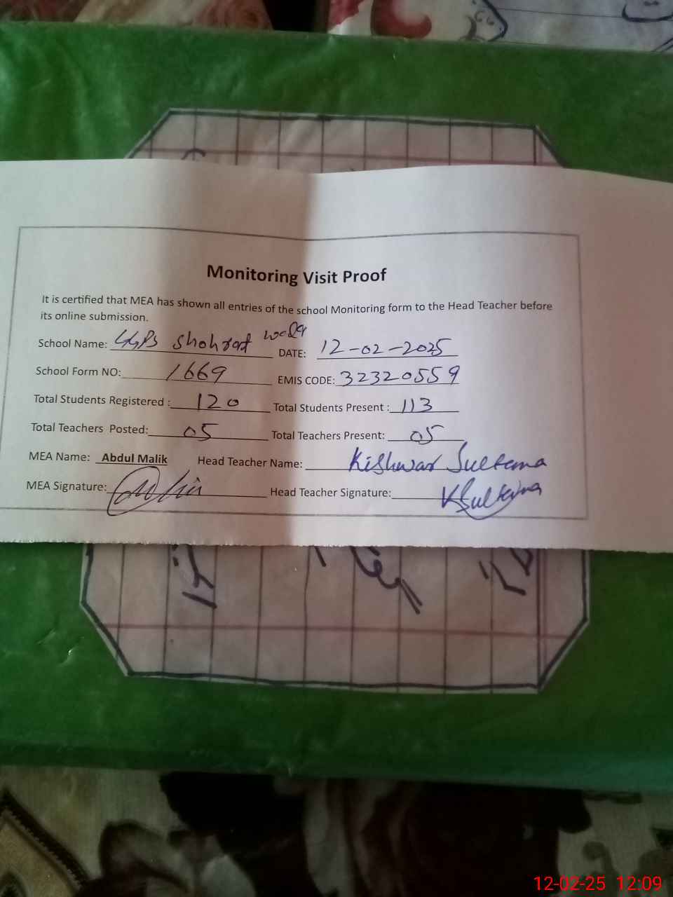 | Attendance Register | Head Teacher | MEA with School | Visit Proof |