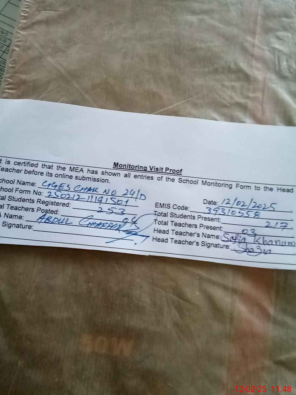 | Attendance Register | Head Teacher | MEA with School | Visit Proof |