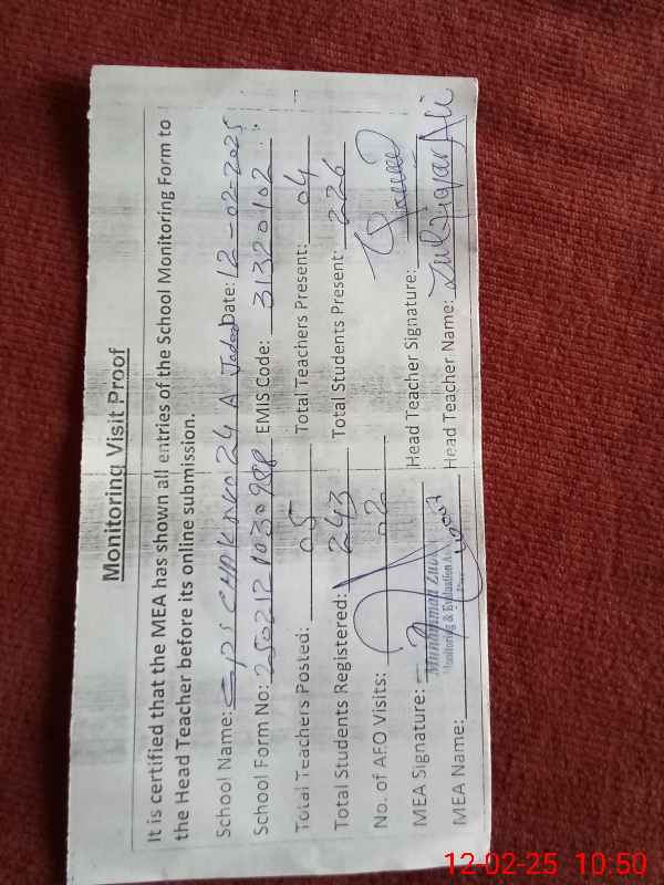 | Attendance Register | Head Teacher | MEA with School | Visit Proof |