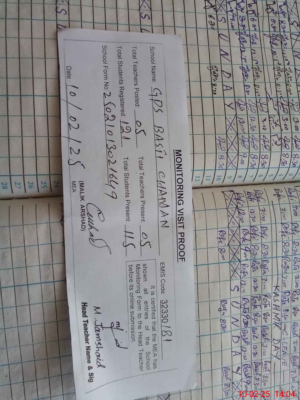 | Attendance Register | Head Teacher | MEA with School | Visit Proof |