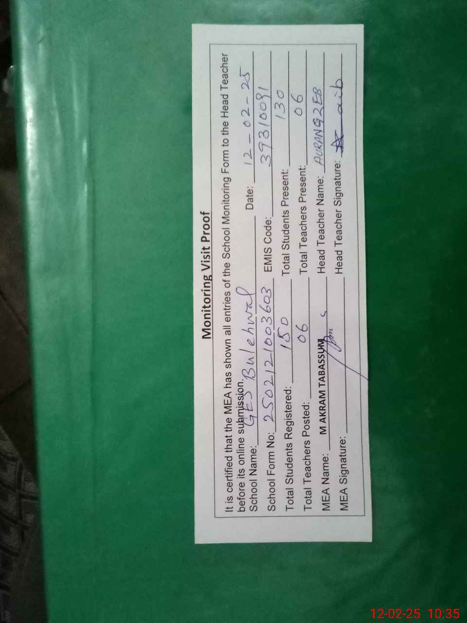 | Attendance Register | Head Teacher | MEA with School | Visit Proof |