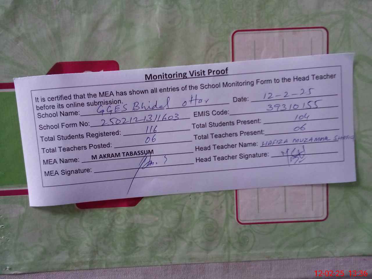 | Attendance Register | Head Teacher | MEA with School | Visit Proof |