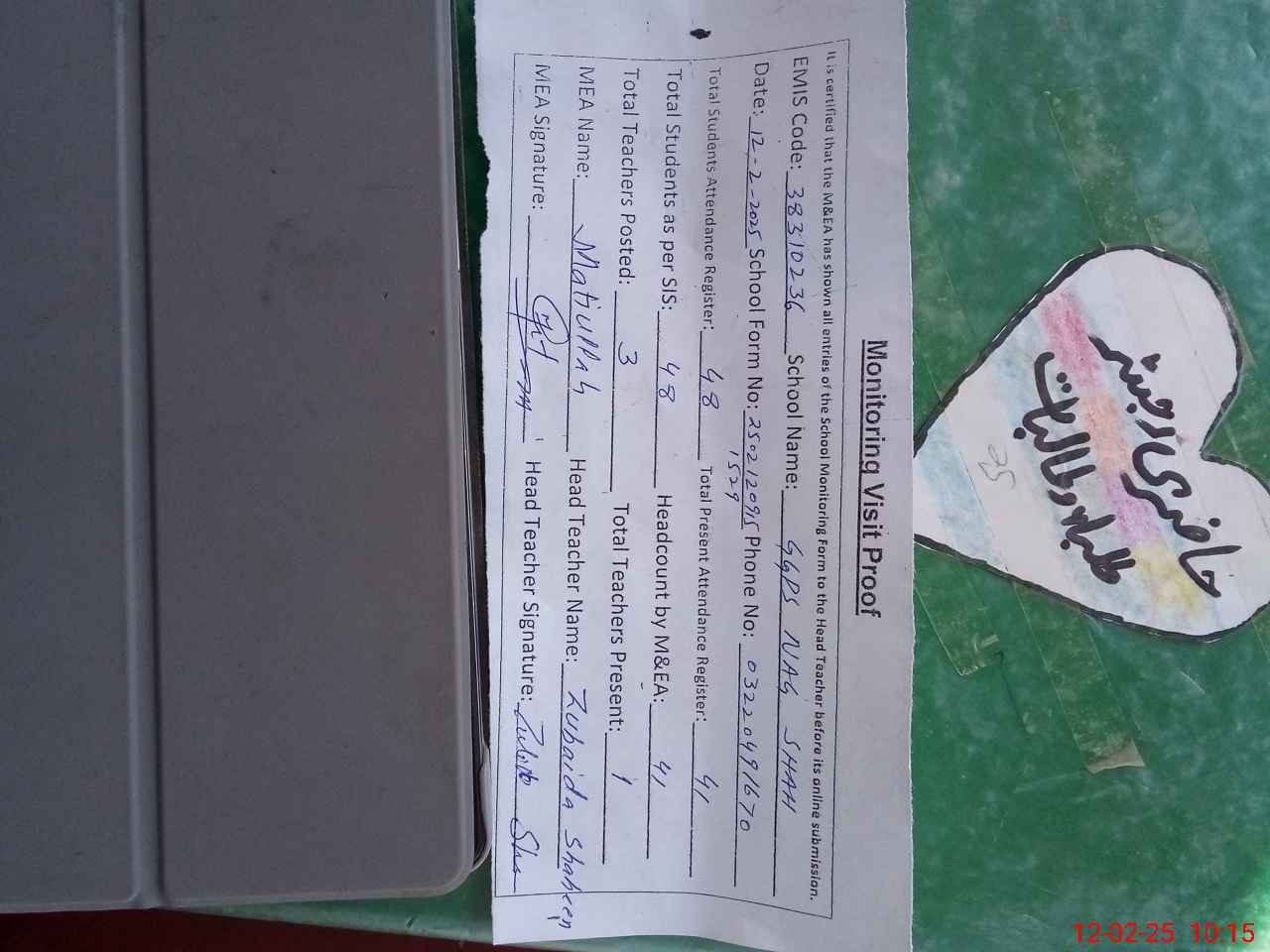 | Attendance Register | Head Teacher | MEA with School | Visit Proof |