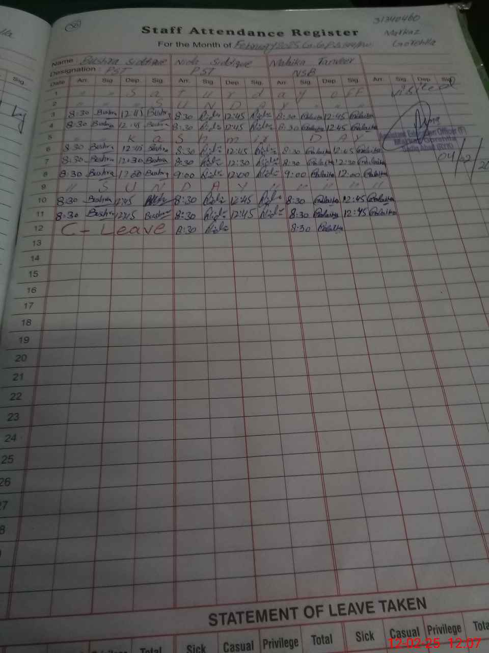 | CNIC | Full Name | Designation | R/C | Absence During Last Calender Month |