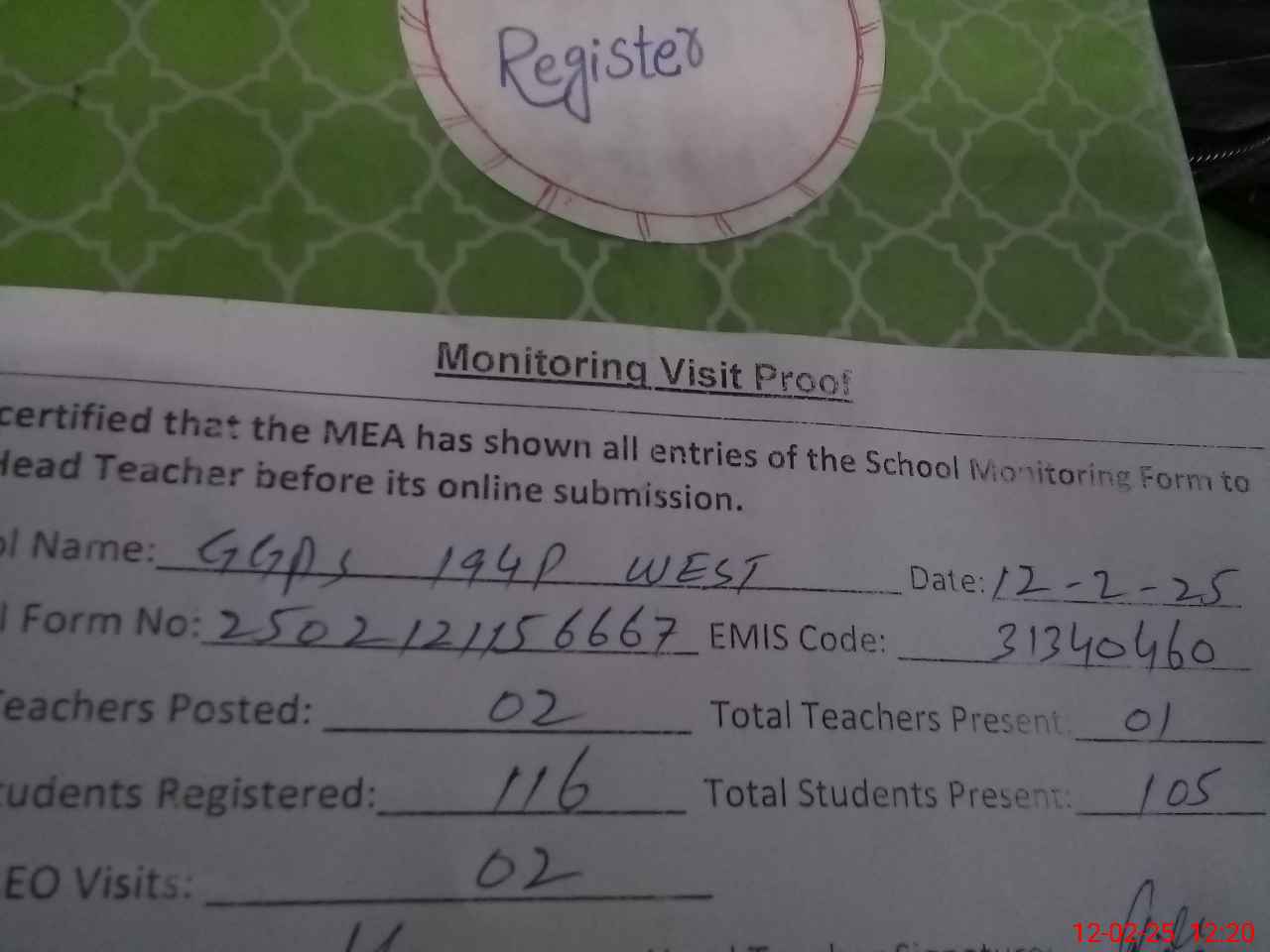 | Attendance Register | Head Teacher | MEA with School | Visit Proof |