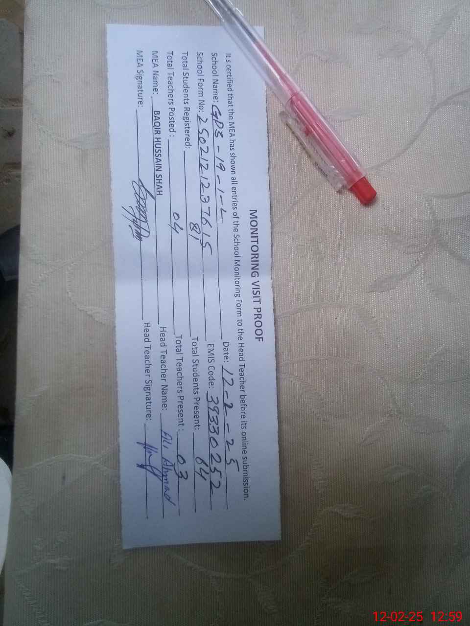 | Attendance Register | Head Teacher | MEA with School | Visit Proof |