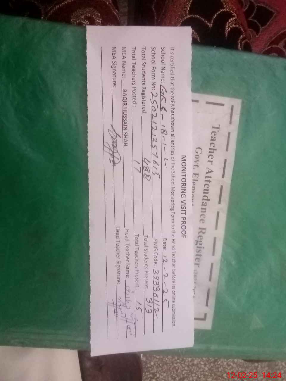 | Attendance Register | Head Teacher | MEA with School | Visit Proof |