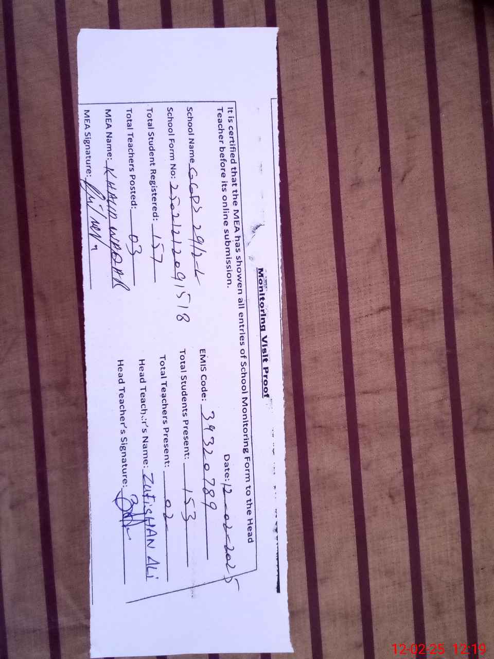| Attendance Register | Head Teacher | MEA with School | Visit Proof |