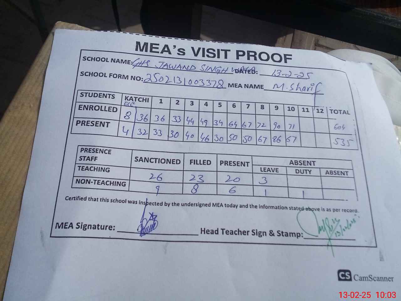 | Attendance Register | Head Teacher | MEA with School | Visit Proof |
