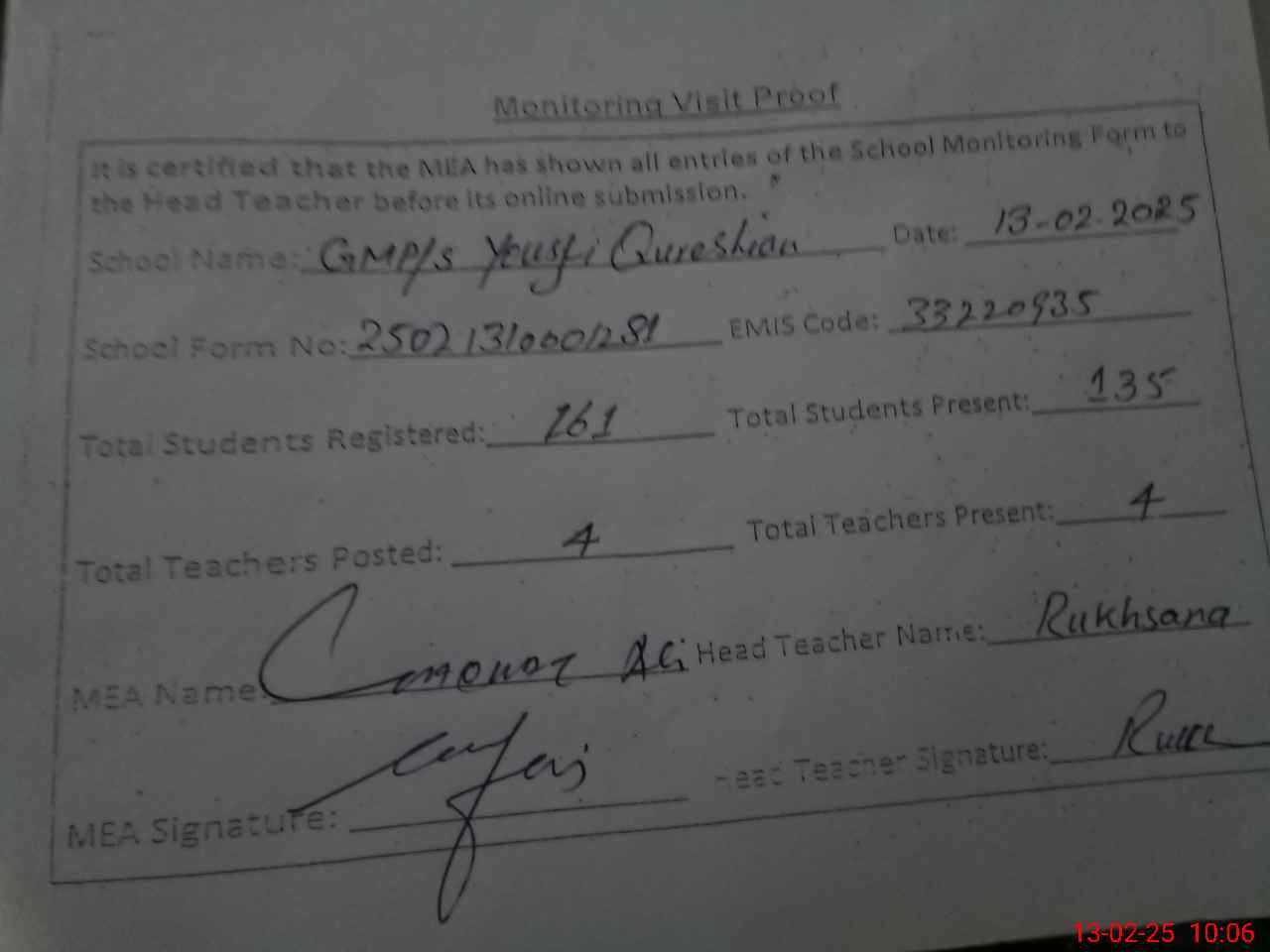| Attendance Register | Head Teacher | MEA with School | Visit Proof |