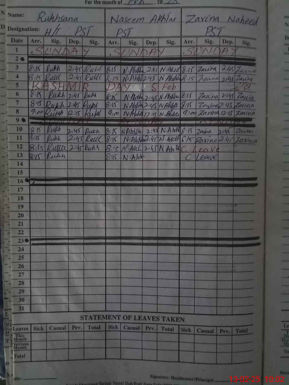 | CNIC | Full Name | Designation | R/C | Absence During Last Calender Month |