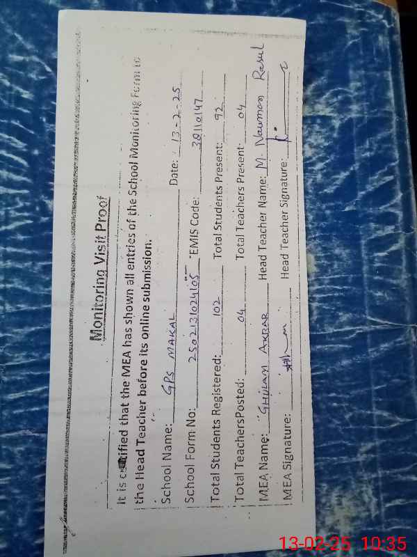 | Attendance Register | Head Teacher | MEA with School | Visit Proof |