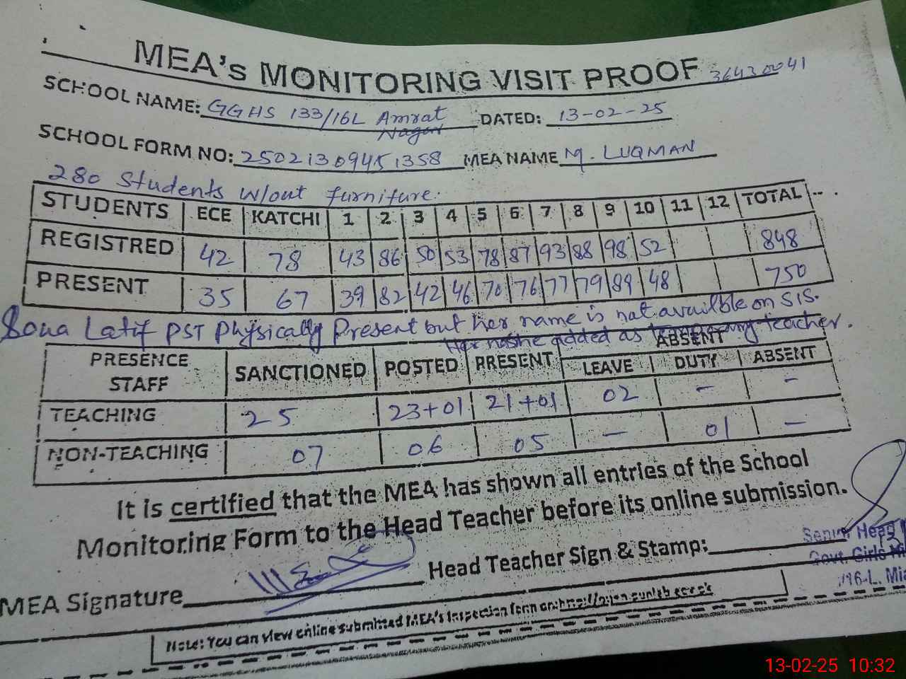| Attendance Register | Head Teacher | MEA with School | Visit Proof |