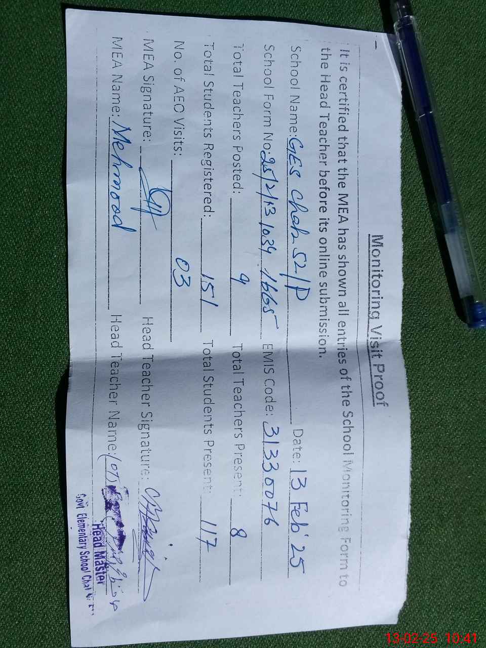 | Attendance Register | Head Teacher | MEA with School | Visit Proof |