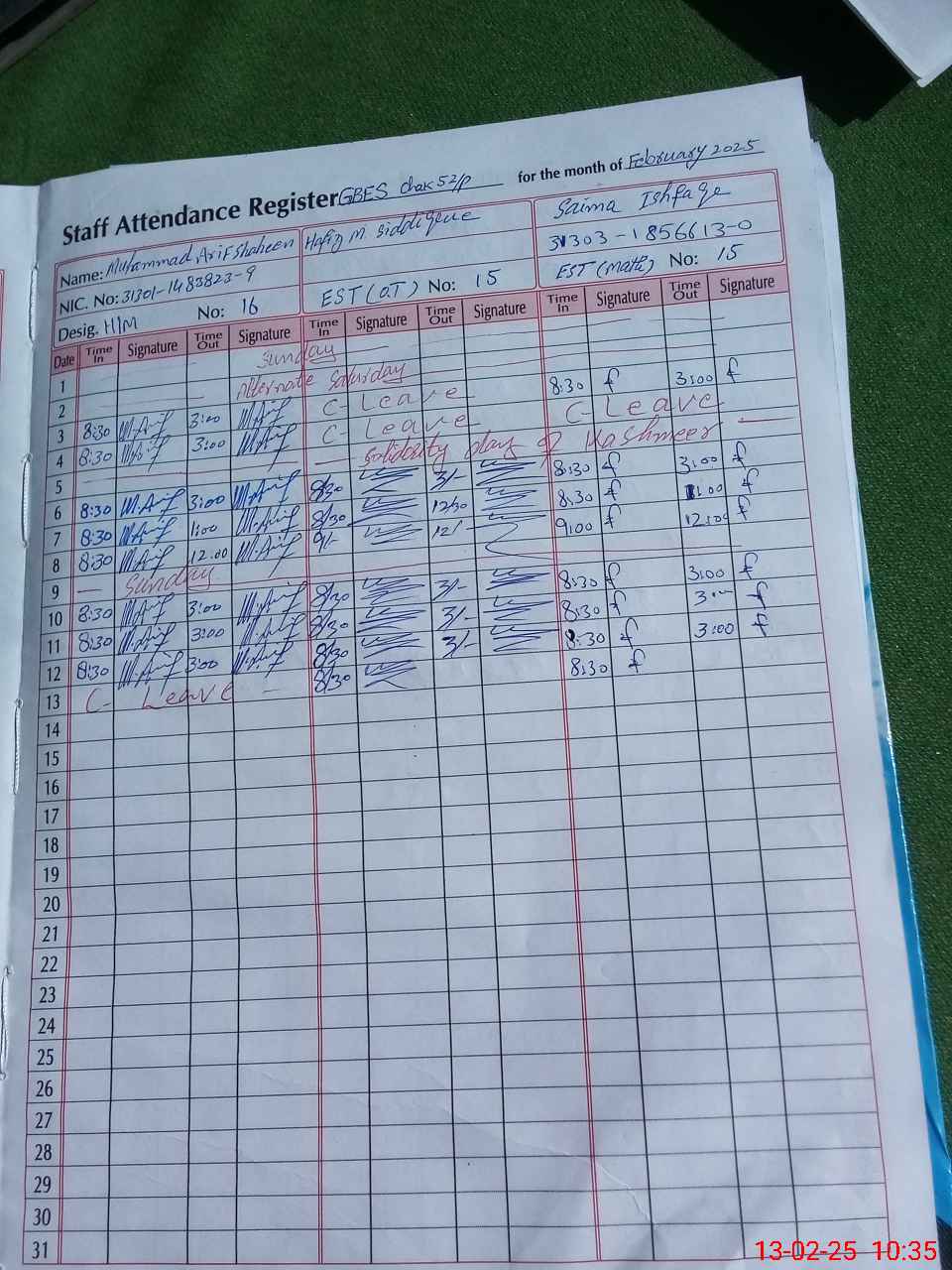 | CNIC | Full Name | Designation | R/C | Absence During Last Calender Month |
