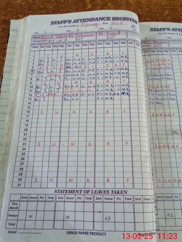 | CNIC | Full Name | Designation | R/C | Absence During Last Calender Month |
