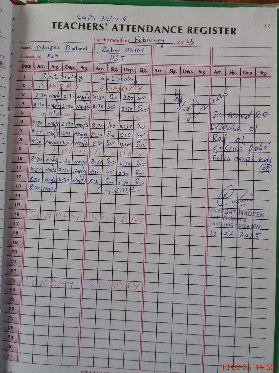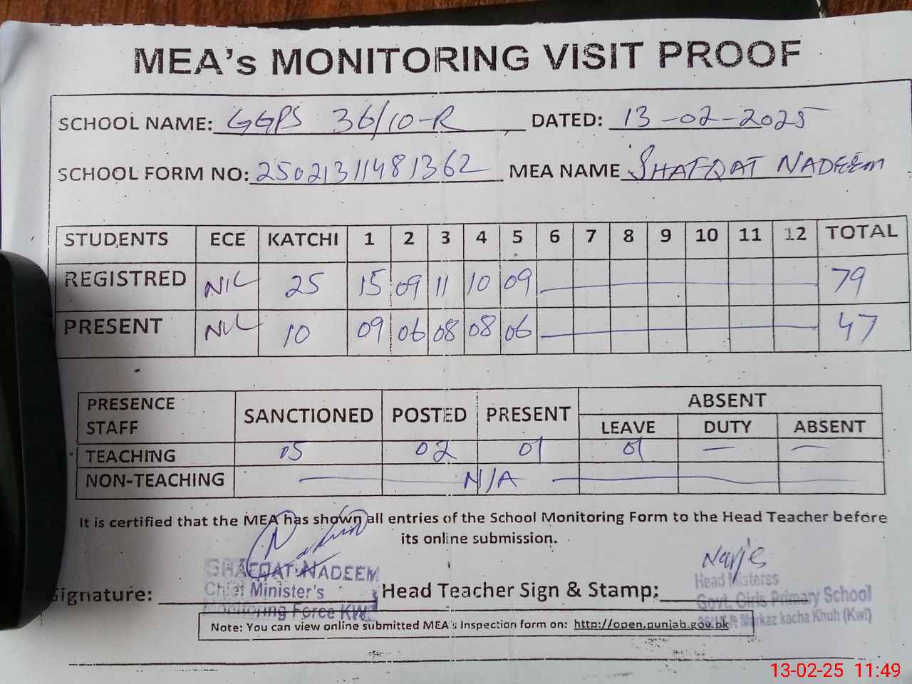 | Attendance Register | Head Teacher | MEA with School | Visit Proof |