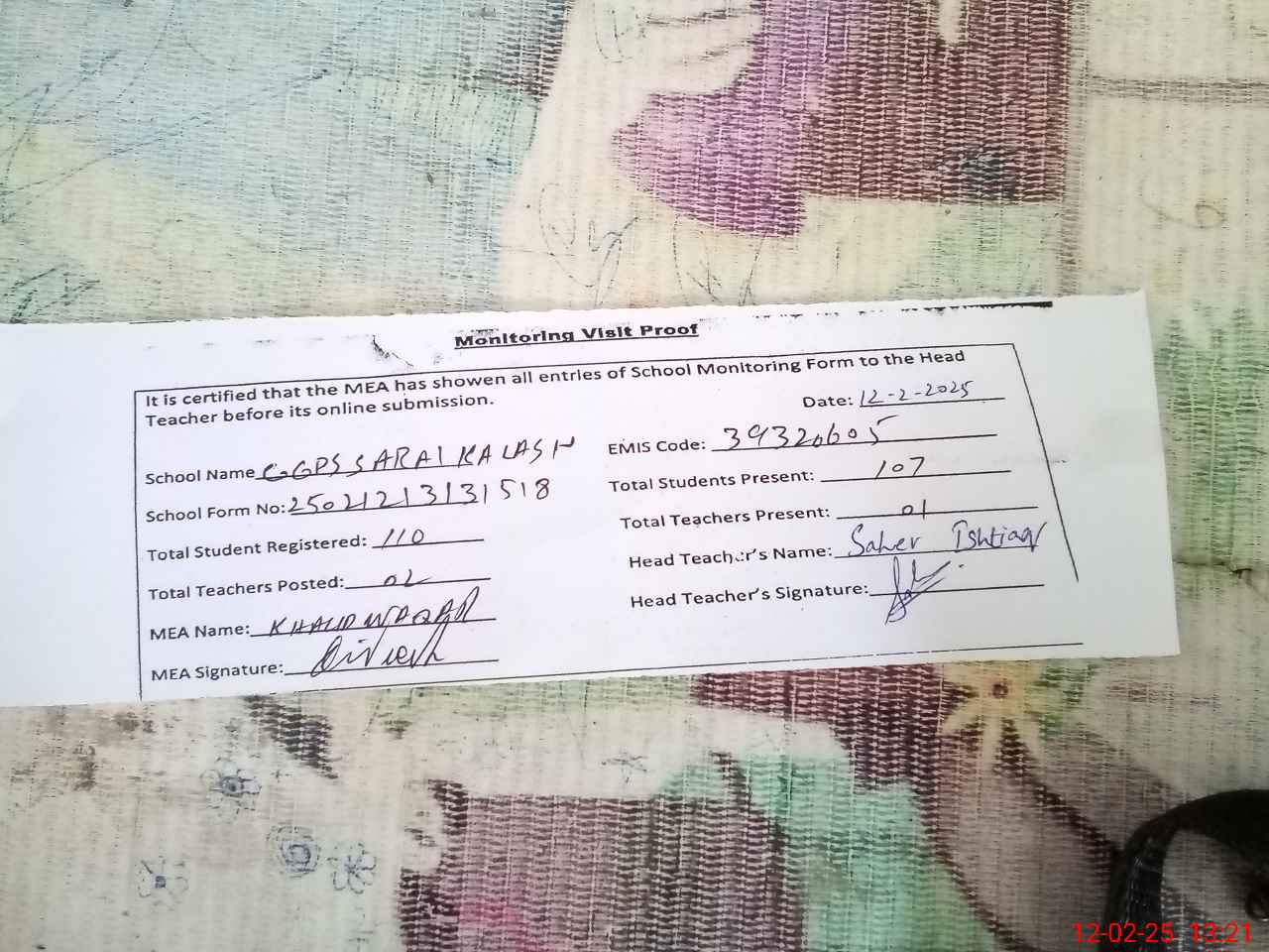 | EMIS Code: 39320605 | Name of School: GGPS SARAI KALASAN | |||