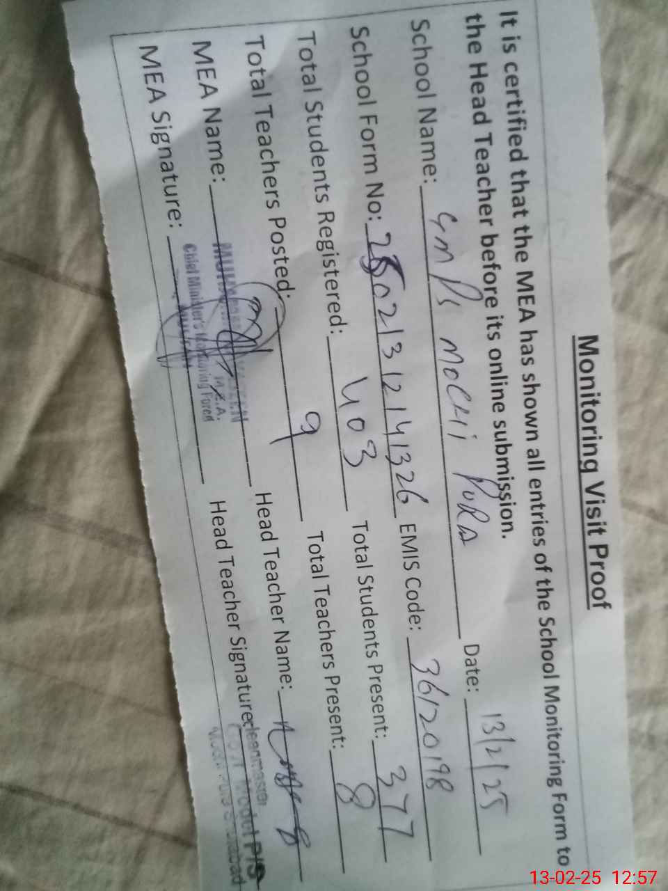 | Attendance Register | Head Teacher | MEA with School | Visit Proof |