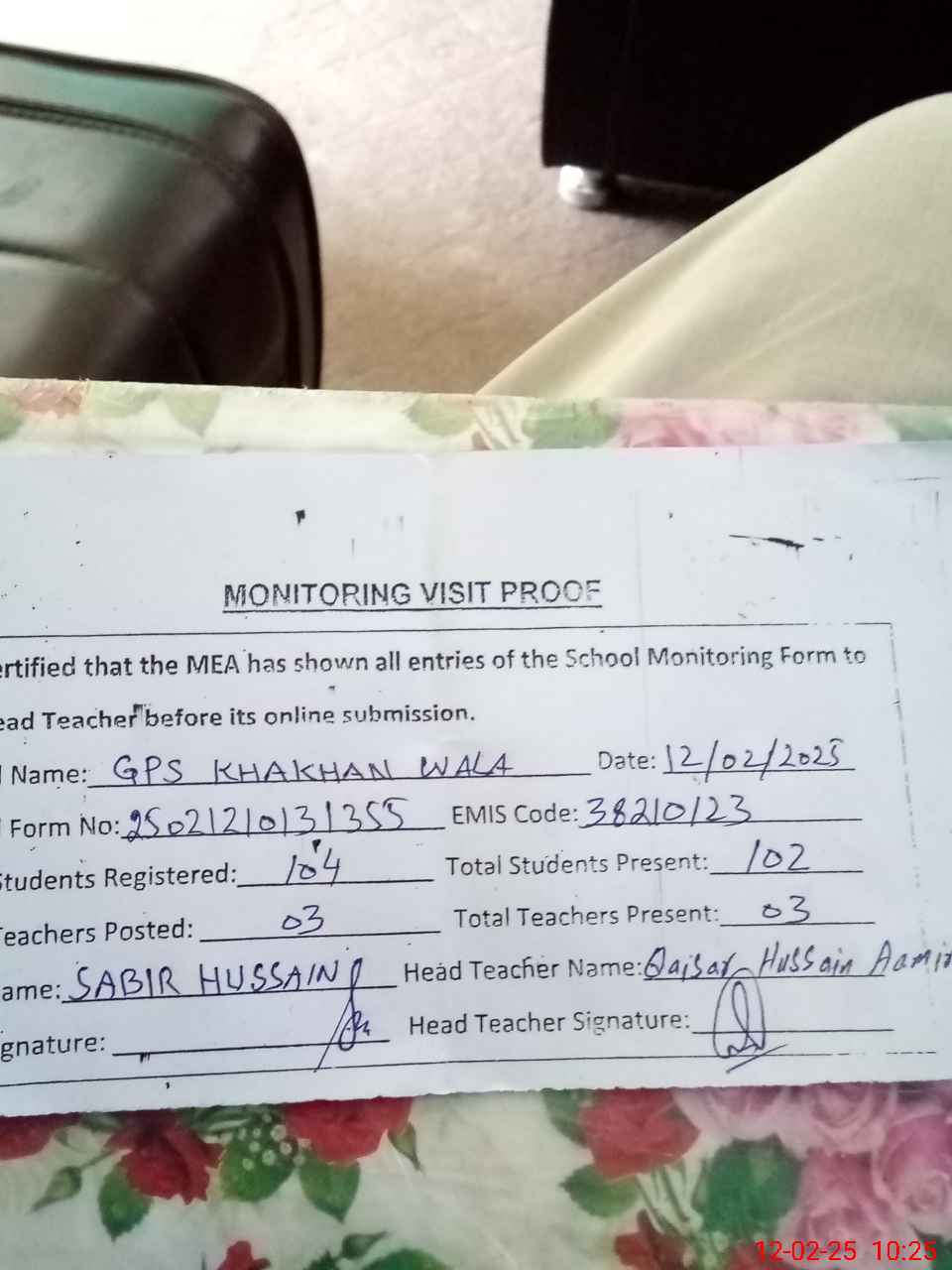 | Attendance Register | Head Teacher | MEA with School | Visit Proof |