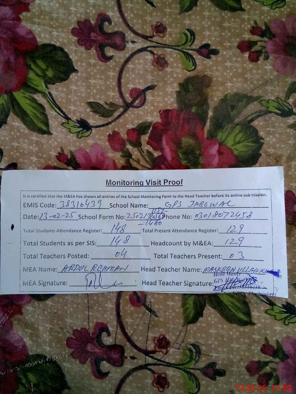 | Attendance Register | Head Teacher | MEA with School | Visit Proof |
