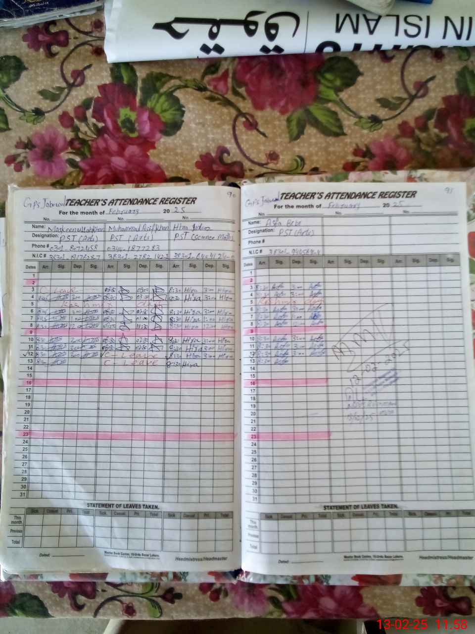 | CNIC | Full Name | Designation | R/C | Absence During Last Calender Month |