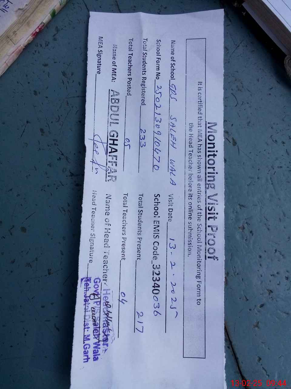 | EMIS Code: 32340036 | Name of School: GPS SALEH WALA | |||