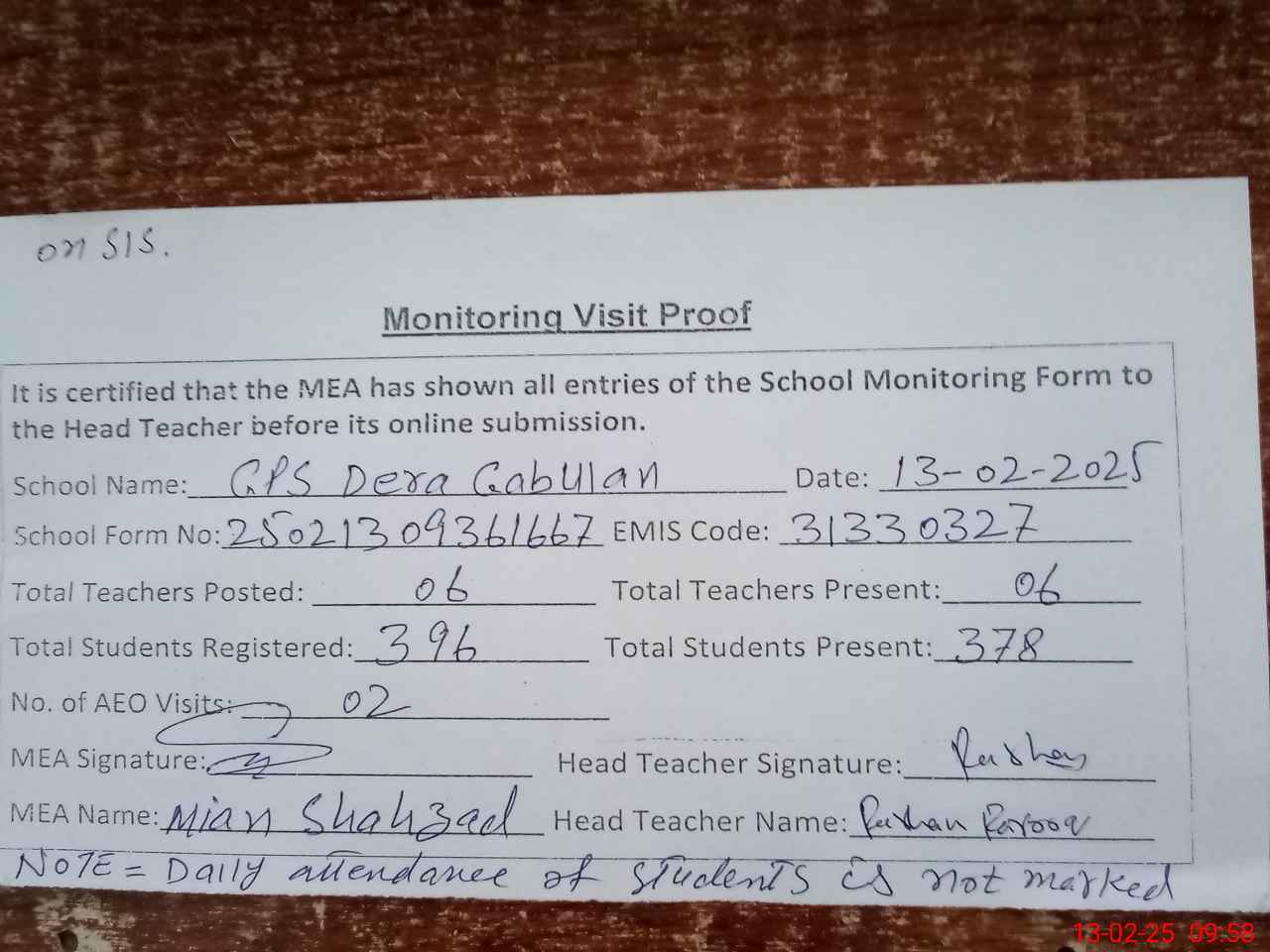 | Attendance Register | Head Teacher | MEA with School | Visit Proof |