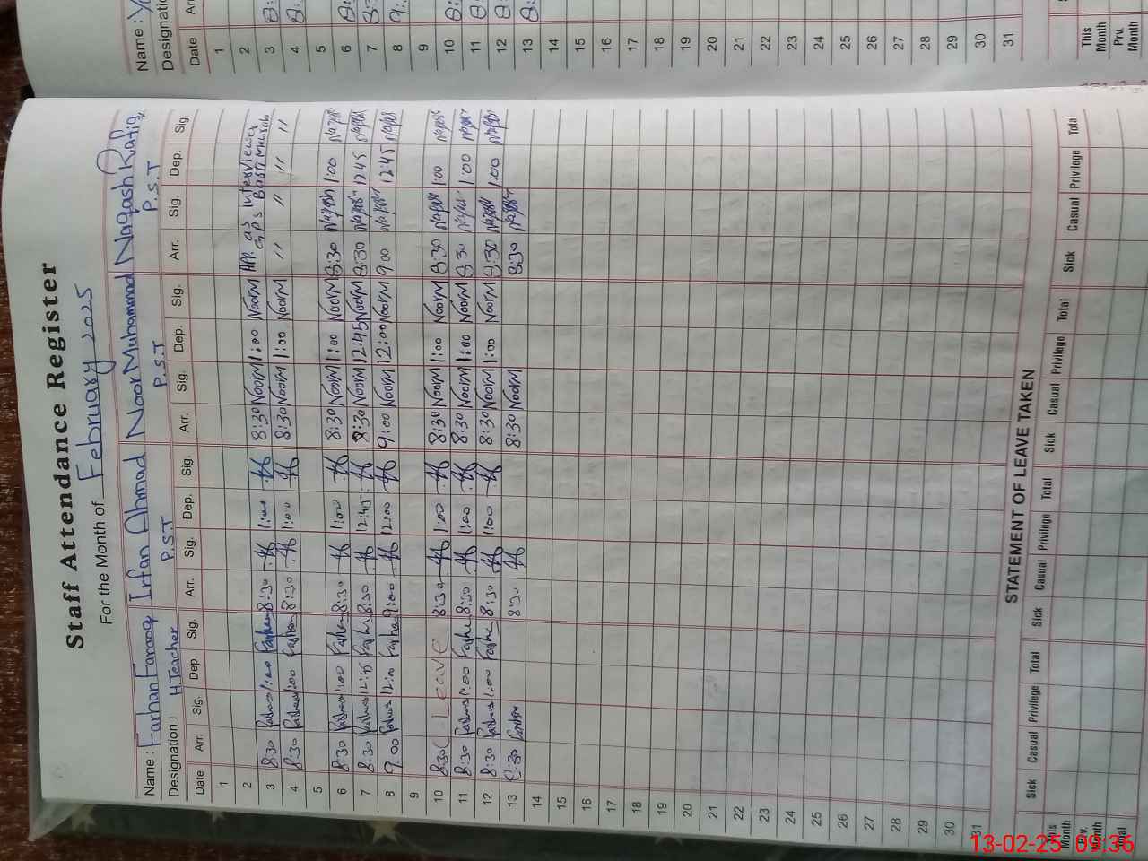 | CNIC | Full Name | Designation | R/C | Absence During Last Calender Month |