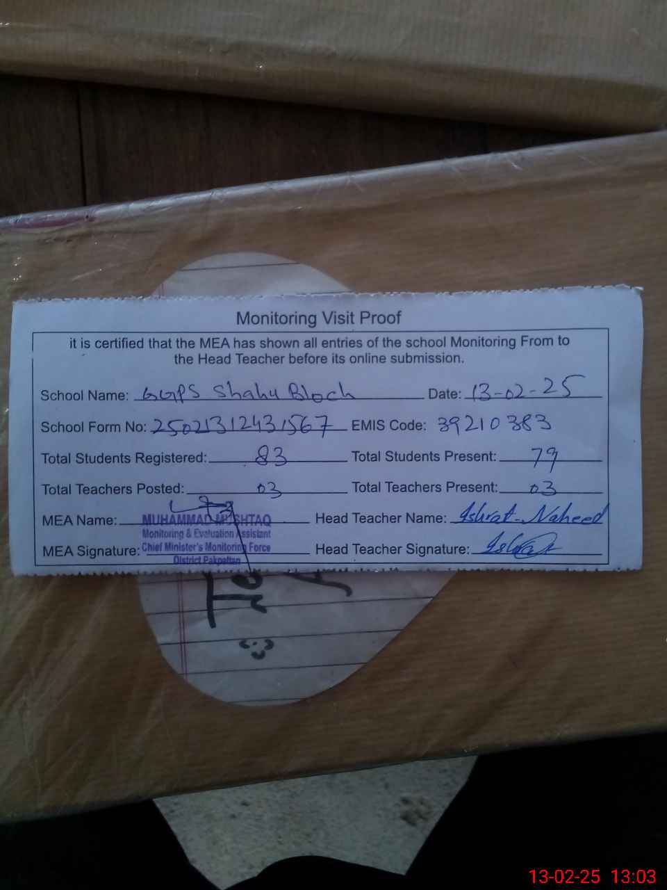 | Attendance Register | Head Teacher | MEA with School | Visit Proof |