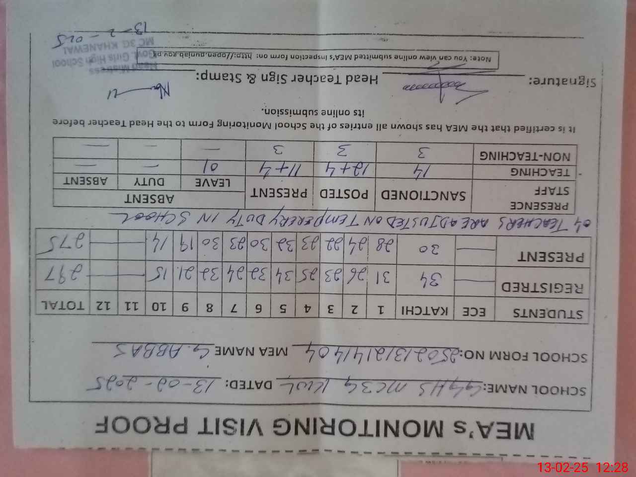 | Attendance Register | Head Teacher | MEA with School | Visit Proof |