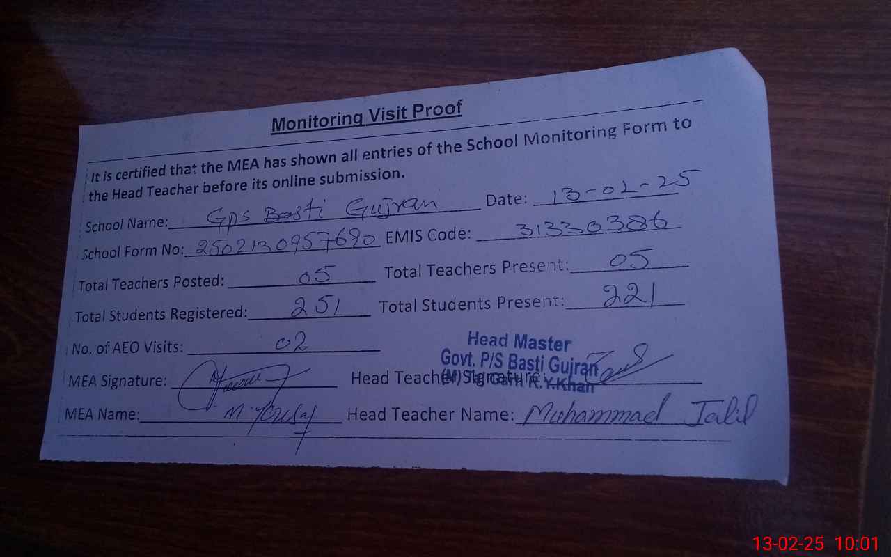 | EMIS Code: 31330386 | Name of School: GPS BASTI GUJRAN | |||